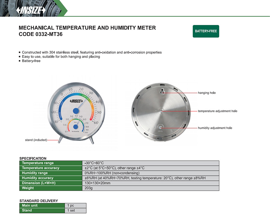 0332-MT36 Mechanical internal ±2°C (at 5°℃~50°C), other range ±4°C 0%RH~100%RH (non-condensing) 6%RH (at 40%RH~70%RH, testing temperature: 20°C), other range 8%RH -30°C~60°C