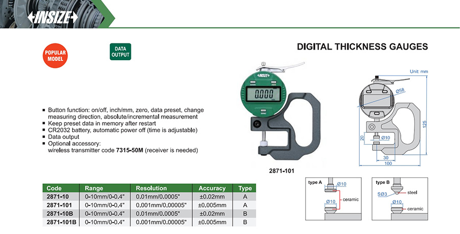 | 2871-101 | 0-10mm/0-0.4" | ±0.005mm | 0.001mm/0.00005" |