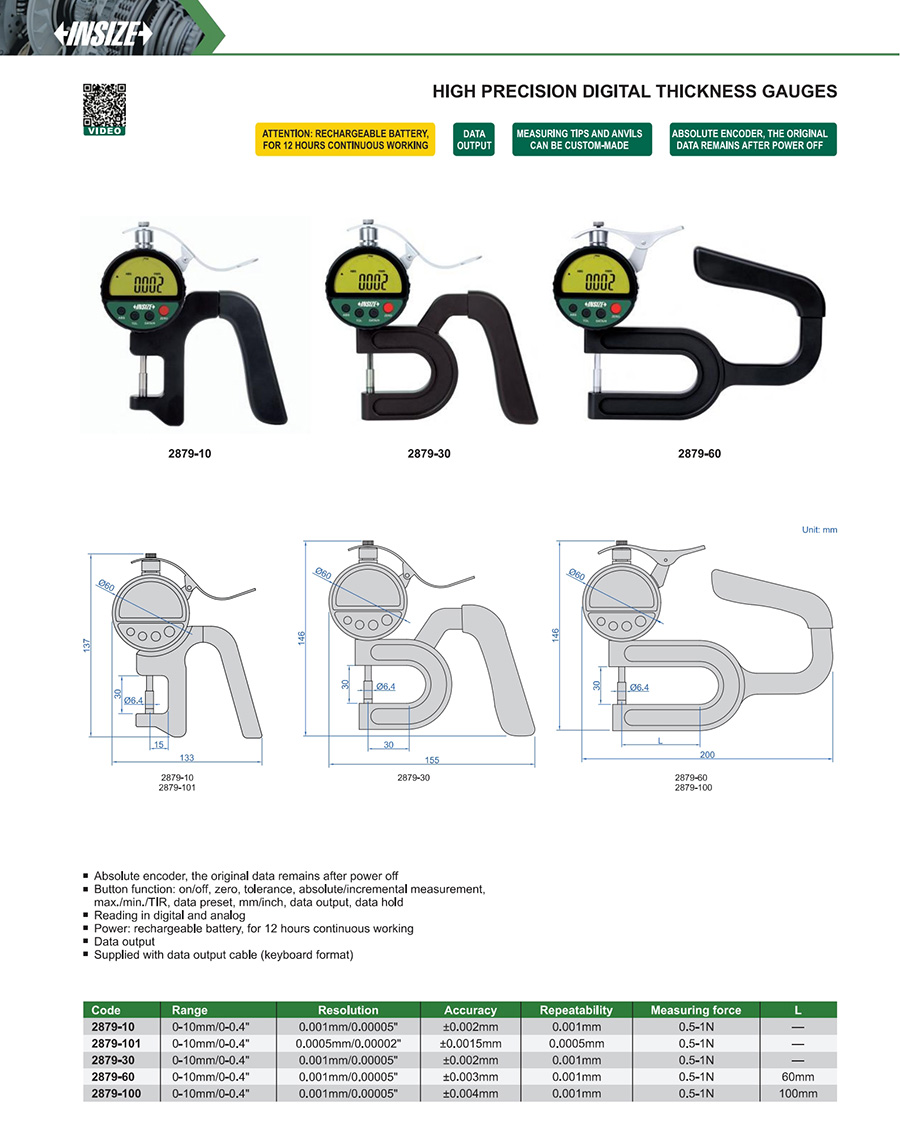 | 2879-30 | 0-10mm/0-0.4" | ±0.002mm | 0.001mm/0.00005" |