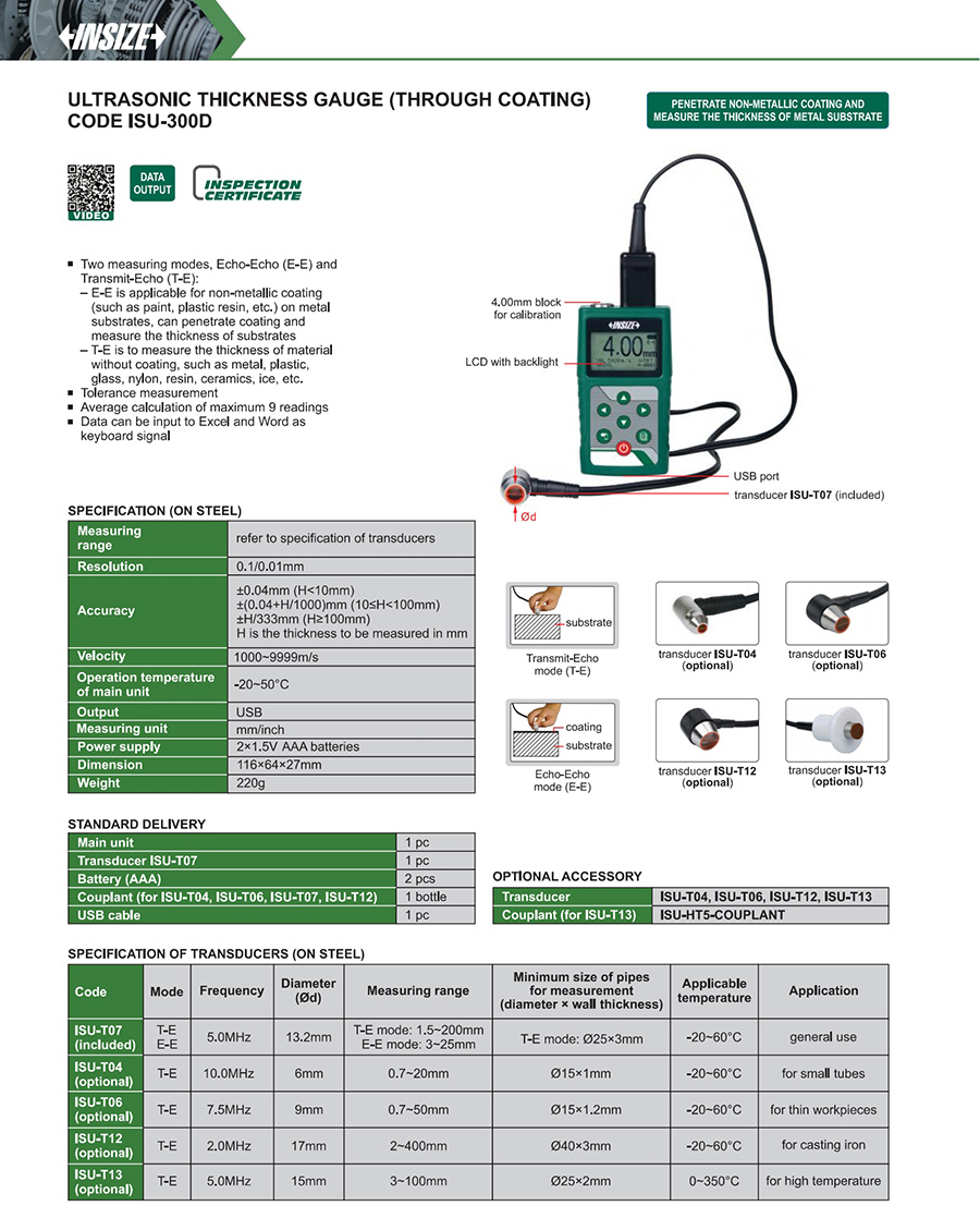 ISU-300D T-E: 1.5~200mm, E-E: 3~25mm ±0.04mm (H<10mm), ±(0.04+H/1000)mm (10≤H<100mm), ±H/333mm (H≥100mm) 5.0MHz USB 1000~9999m/s 13.2mm