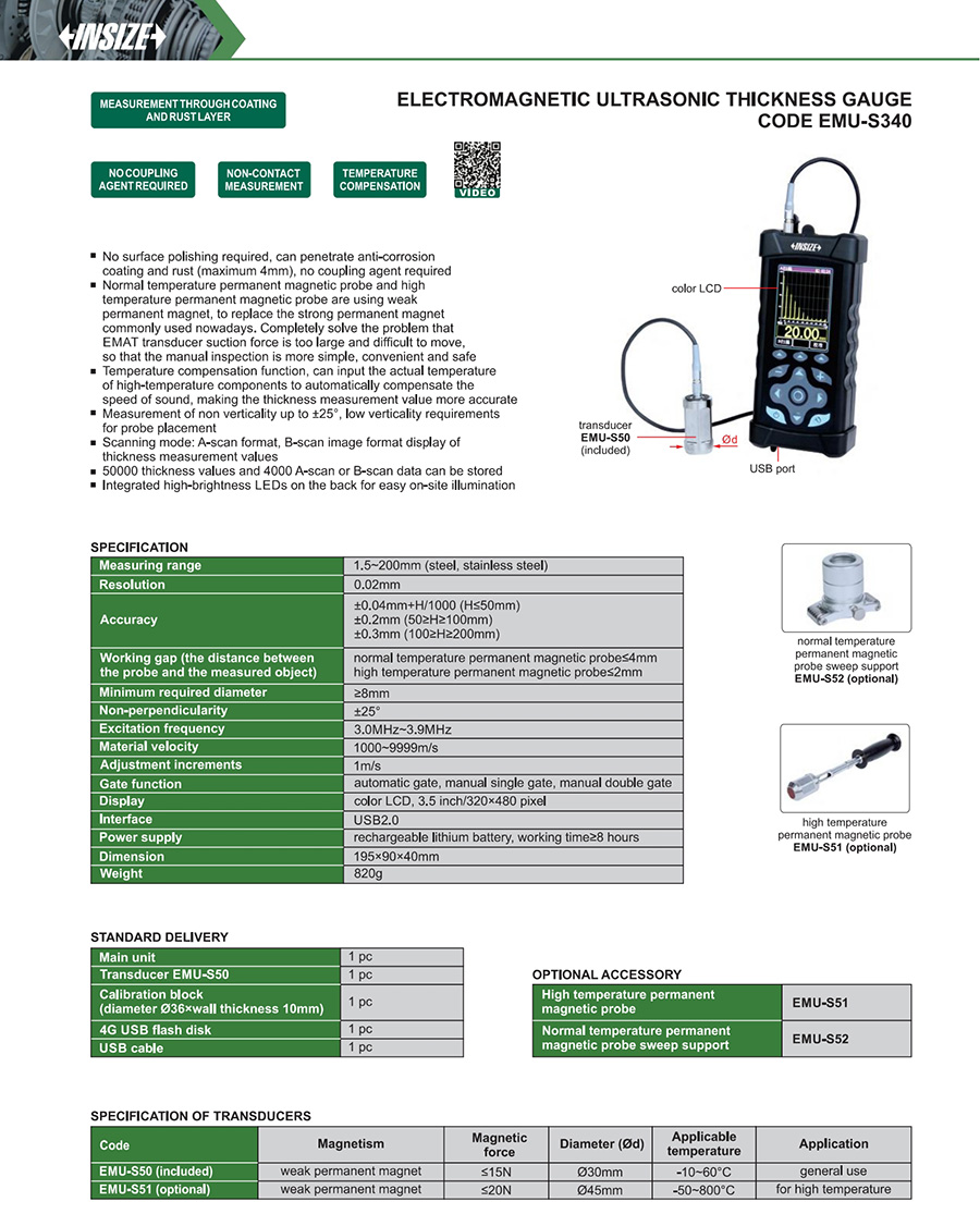 EMU-S340 1.5~200mm ±0.04mm+H/1000 (H≤50mm), ±0.2mm (50≥H≥100mm), ±0.3mm (100≥H≥200mm) USB 2.0 1000~9999m/s 30mm