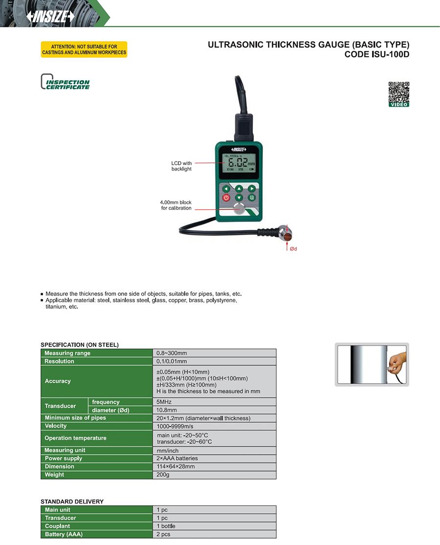 ISU-100D 0.8~300mm ±0.05mm (H<10mm), ±(0.05+H/1000)mm (10≤H<100mm), ±H/333mm (H≥100mm) 5MHz no 1000-9999m/s 10.8mm