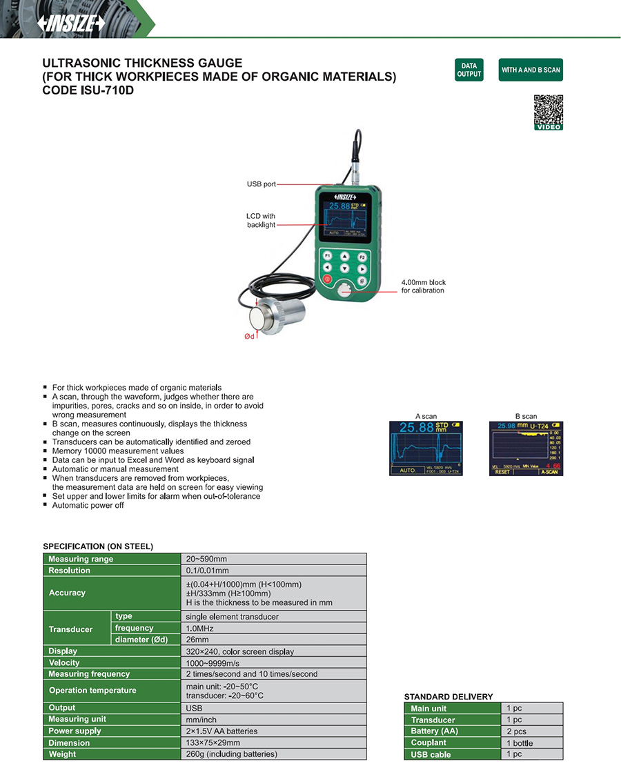 | ISU-710D | 20~590mm | ±(0.04+H/1000)mm (H<100mm), ±H/333mm (H≥100mm) | 1.0MHz | USB | 1000~9999m/s | 26mm |