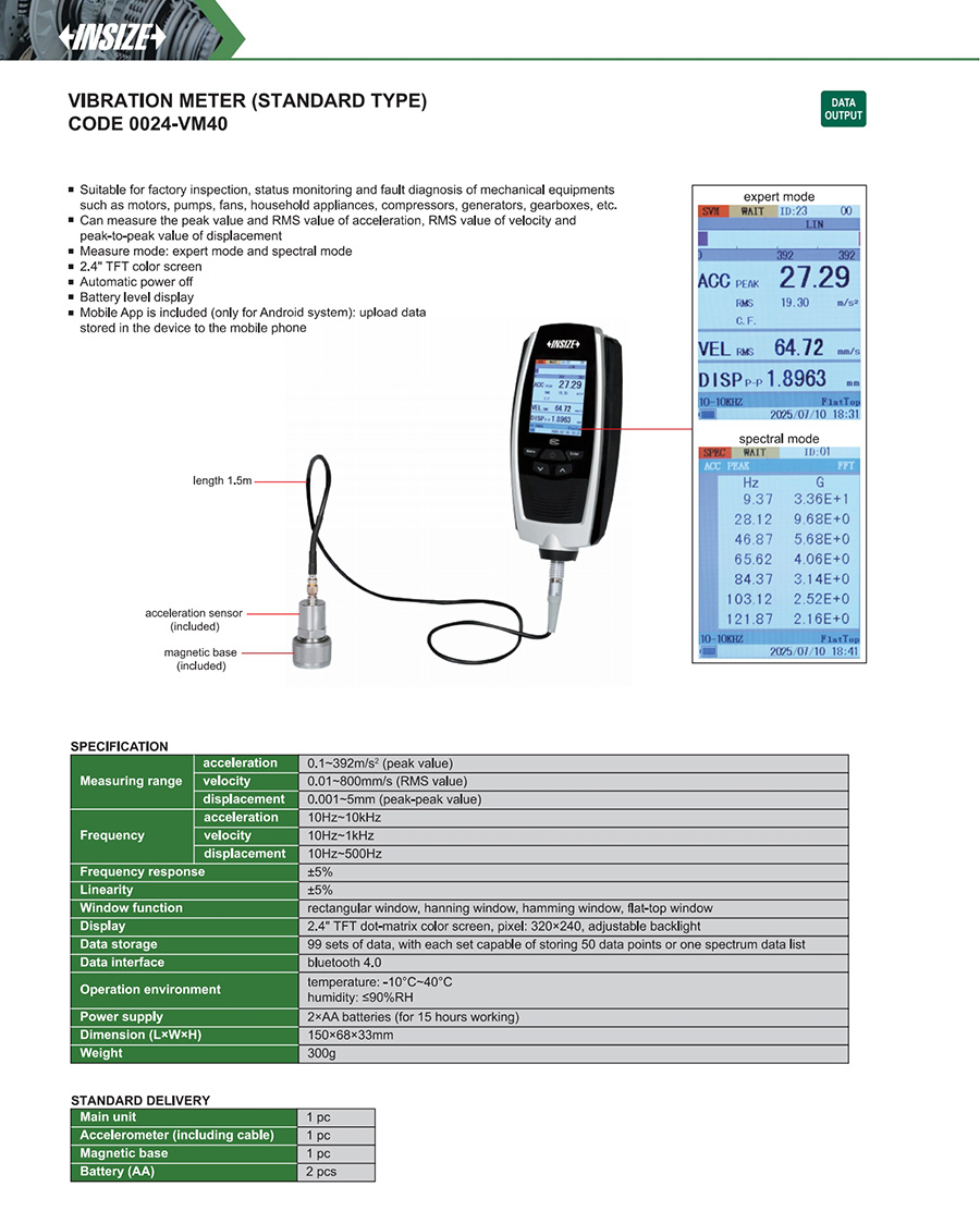 Can measure the peak value and RMS value of acceleration, RMS value of velocity and peak-to-peak value of displacement