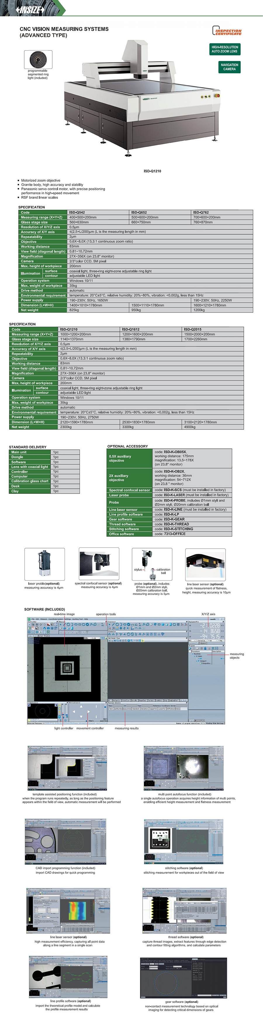 | ISD-Q1210 | 1000×1200×200mm | ≤(2.5+L/200)µm | 0.5µm | 2µm | 27X~356X (on 23.8'' monitor) | 35kg |