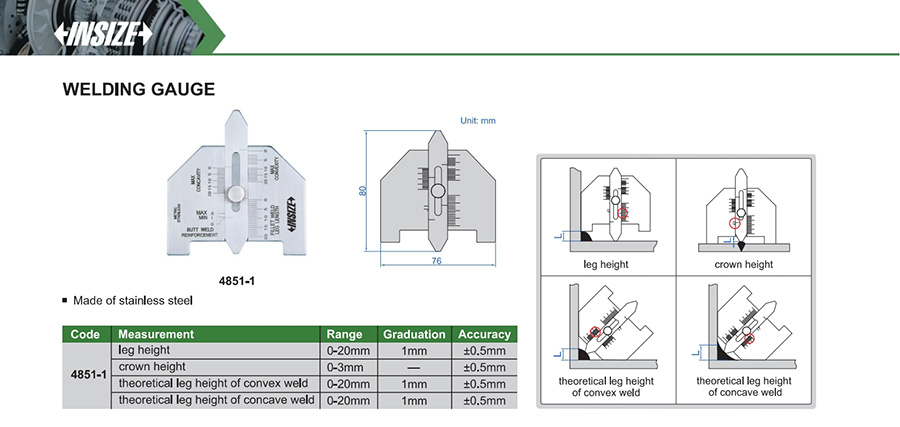 | 4851-1 | 0-20mm | ±0.5mm | 1mm | theoretical leg height of concave weld |